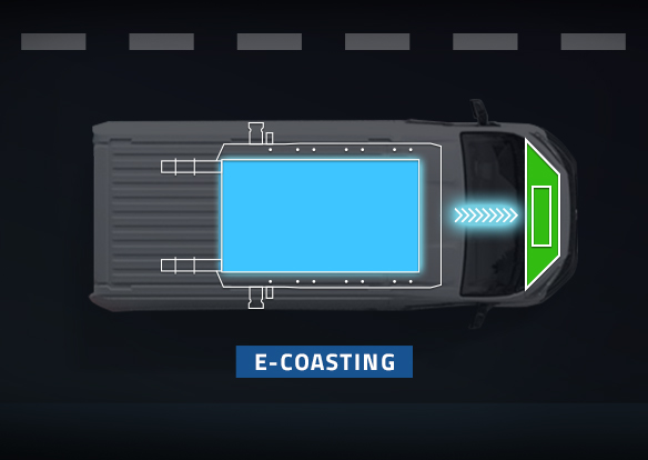 L’E-Coasting offre 4 livelli di decelerazione del veicolo senza l’azione del pedale del freno. In questa modalità il motore elettrico fornisce una coppia negativa per ricaricare la batteria. Per passare agilmente attraverso i quattro diversi livelli, Ducato è dotato di apposite levette al volante che ne gestiscono l’intensità: dalla libera rotazione alla decelerazione bassa, media o alta.