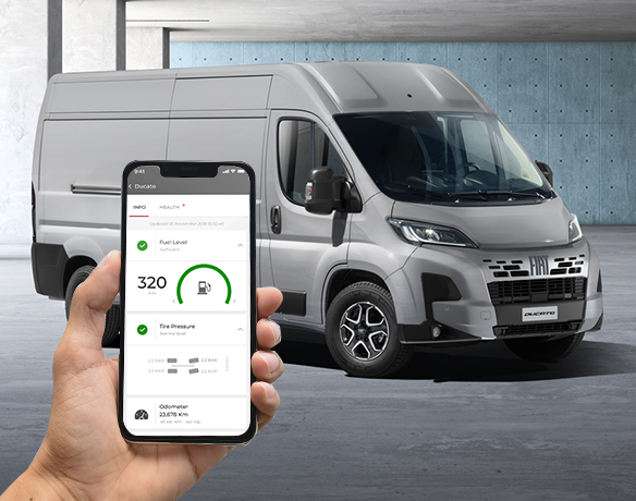 Controlla E-Ducato dal tuo smartphone. Non ricordi se hai chiuso le porte? Nessun problema, bloccale o sbloccale con pochi clic dal tuo dispositivo mobile. Puoi anche trovare facilmente il tuo E-Ducato in un parcheggio affollato o monitorare il tuo furgone elettrico se non sei tu il guidatore.